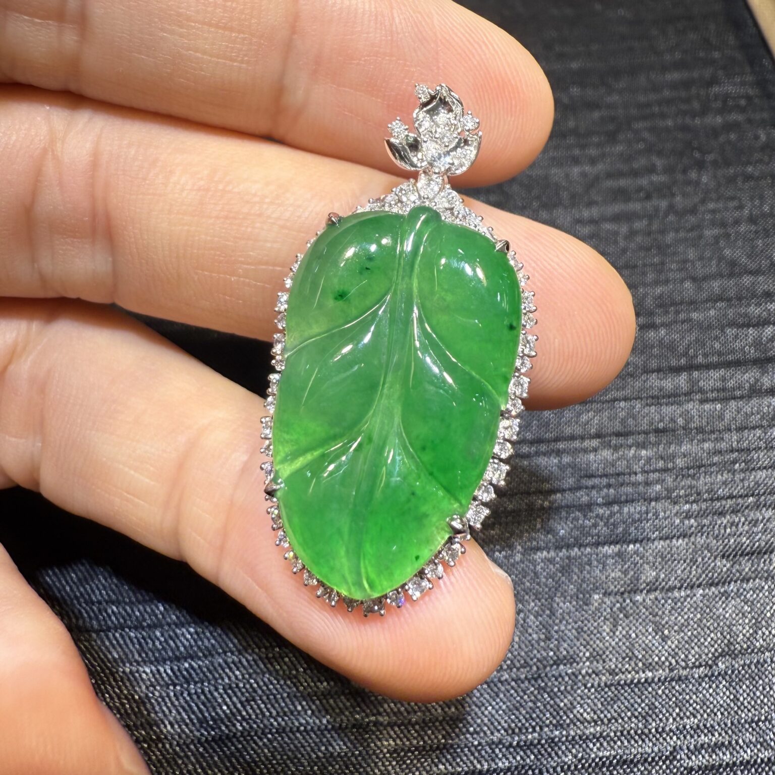 滿綠玉翡翠-滿綠鑲鑽樹葉玉墜