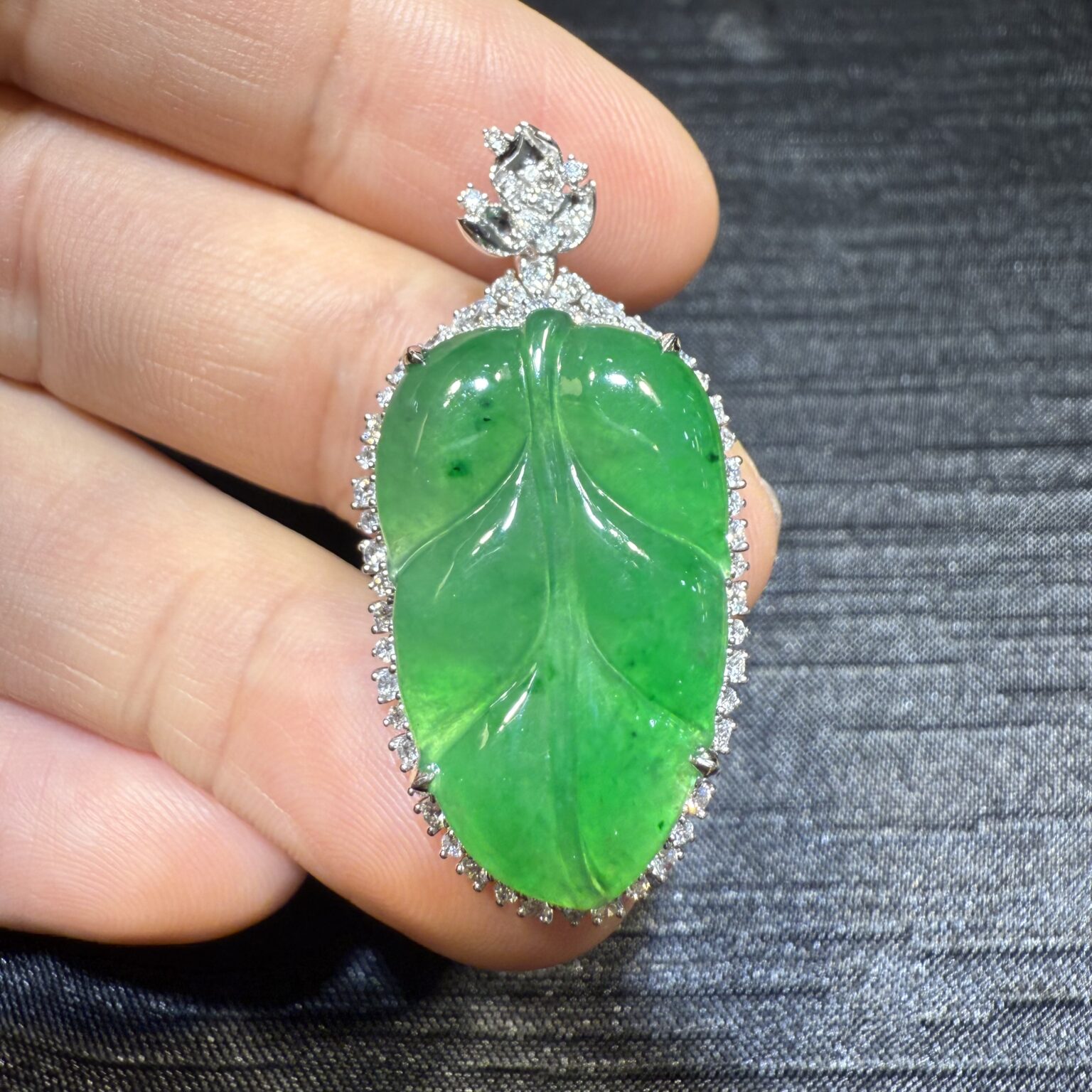 滿綠玉翡翠-滿綠鑲鑽樹葉玉墜