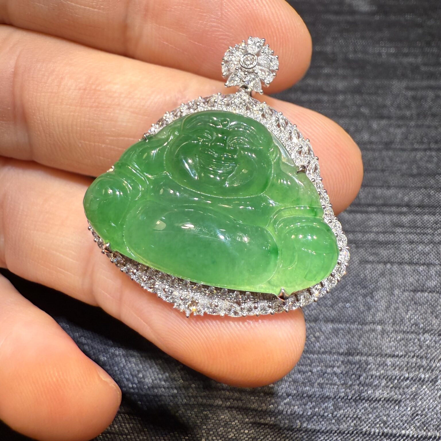 老坑翡翠-鑲鑽滿綠玉佛公掛墜